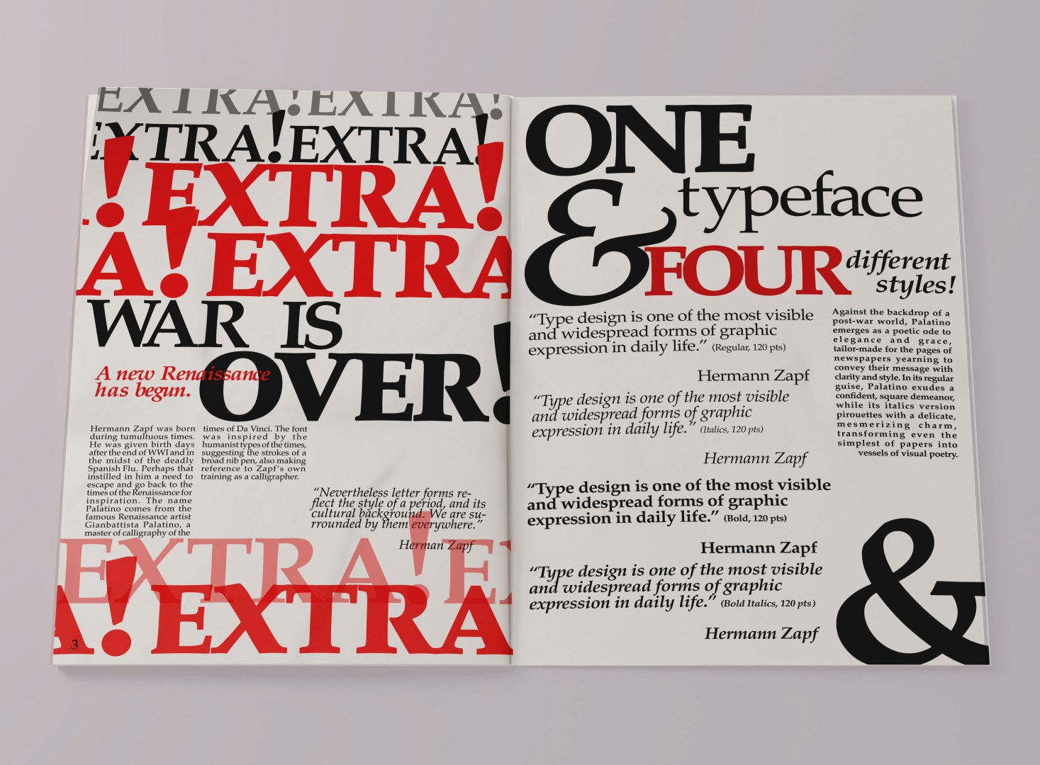 This type specimen book was created to showcase the timeless beauty of Herman Zapf’s Palatino font. Created in the end of WWII, it was created out of the need for legibility even in newsprint stock. Nonetheless, Palatino whispers its story of elegance providing grace and clarity. In its regular style, the font stands steadfast with square, consistent shapes, while its italics style pirouettes wit mesmerizing allure, adding a touch of romance even to the simplest of papers.